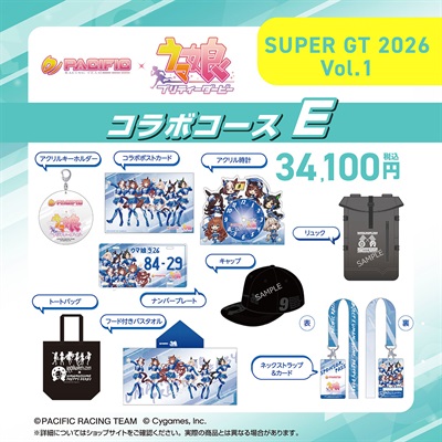 「PACIFIC × ウマ娘 プリティーダービー」コラボ2026の個人スポンサーコースEです。 Dコースまでの全グッズに加え、実用性の高い「リュック」と、羽織れる「フード付きバスタオル」がセットになった、第1期グッズを網羅できる最上位グッズコースです。さらに 特典として、本コラボ公式サイトへスポンサー様のお名前を掲載(任意)させていただきます。