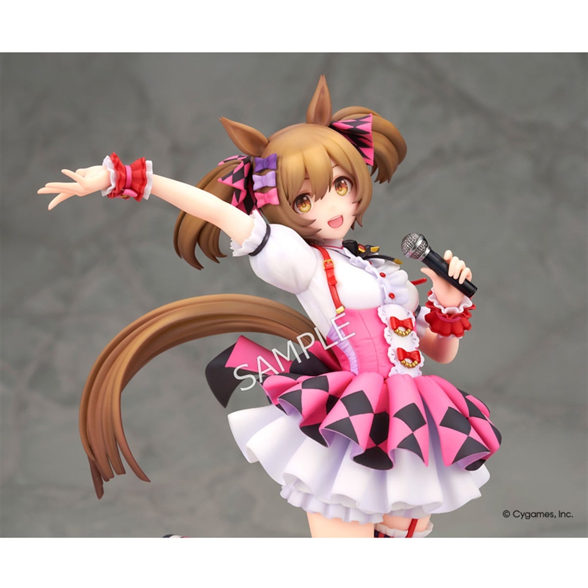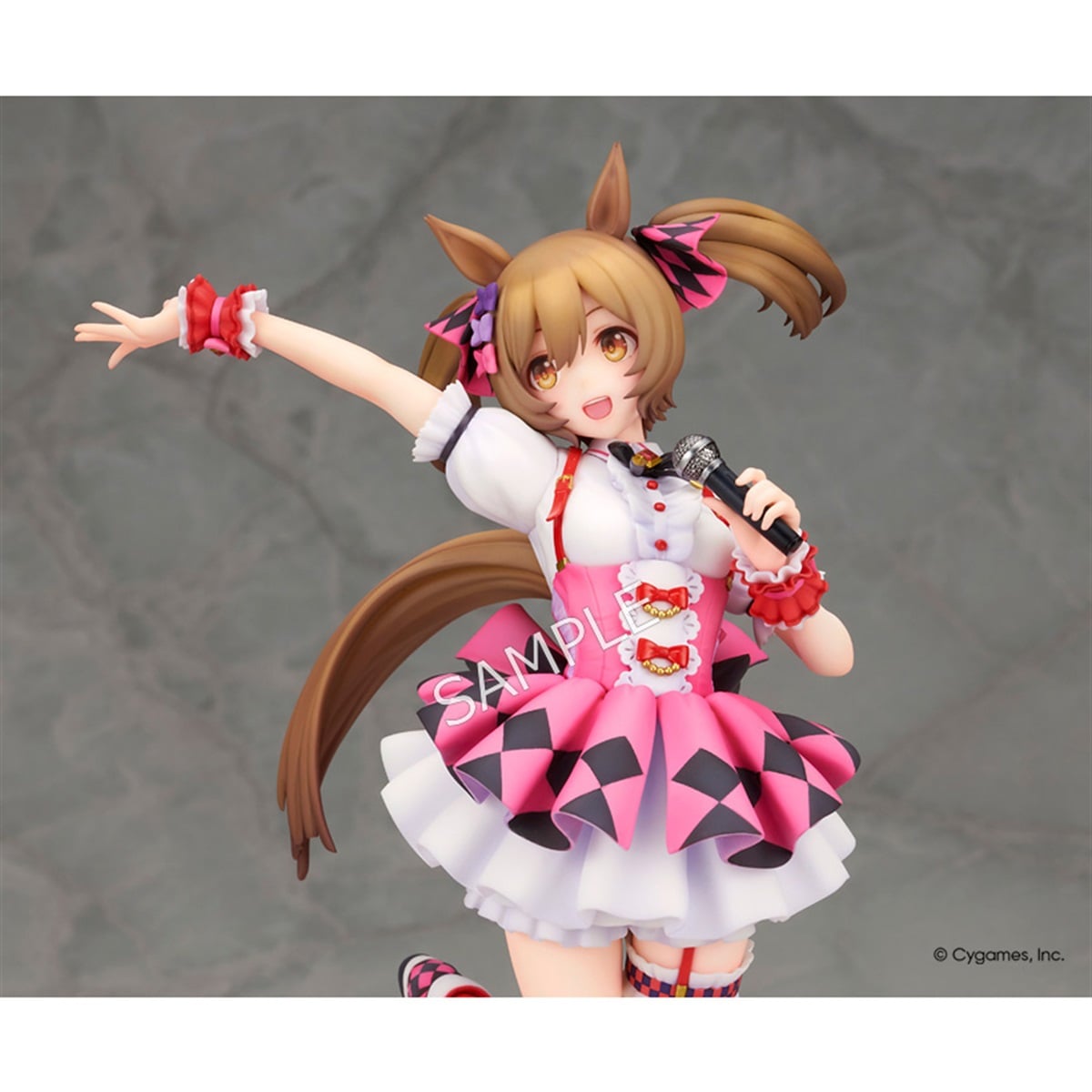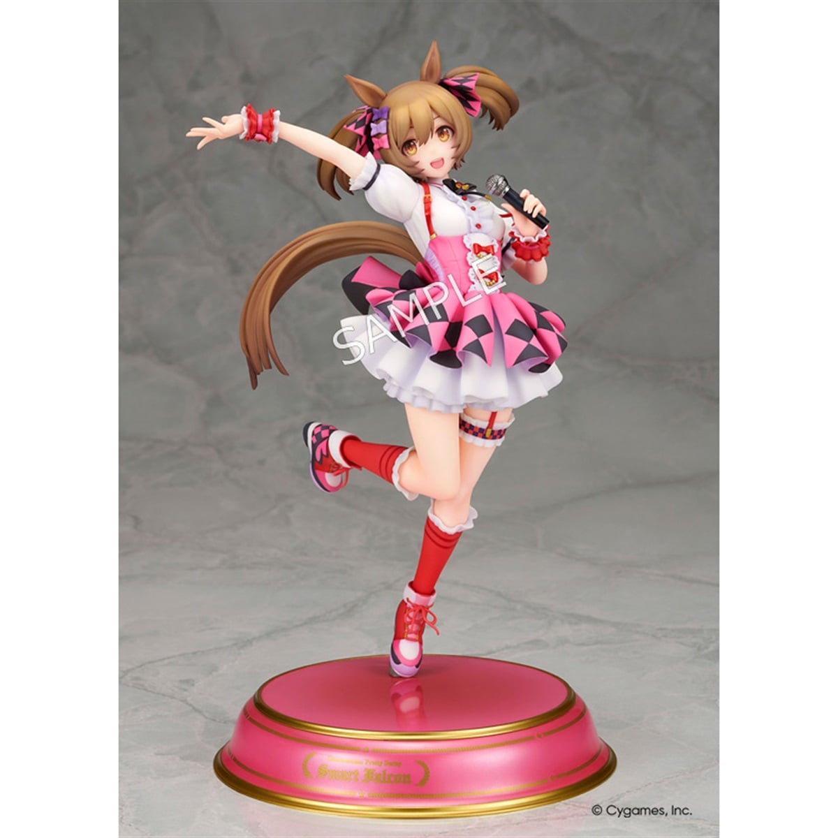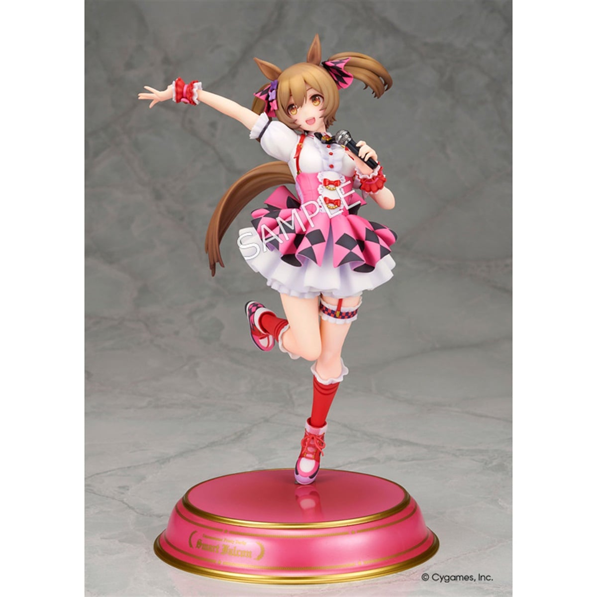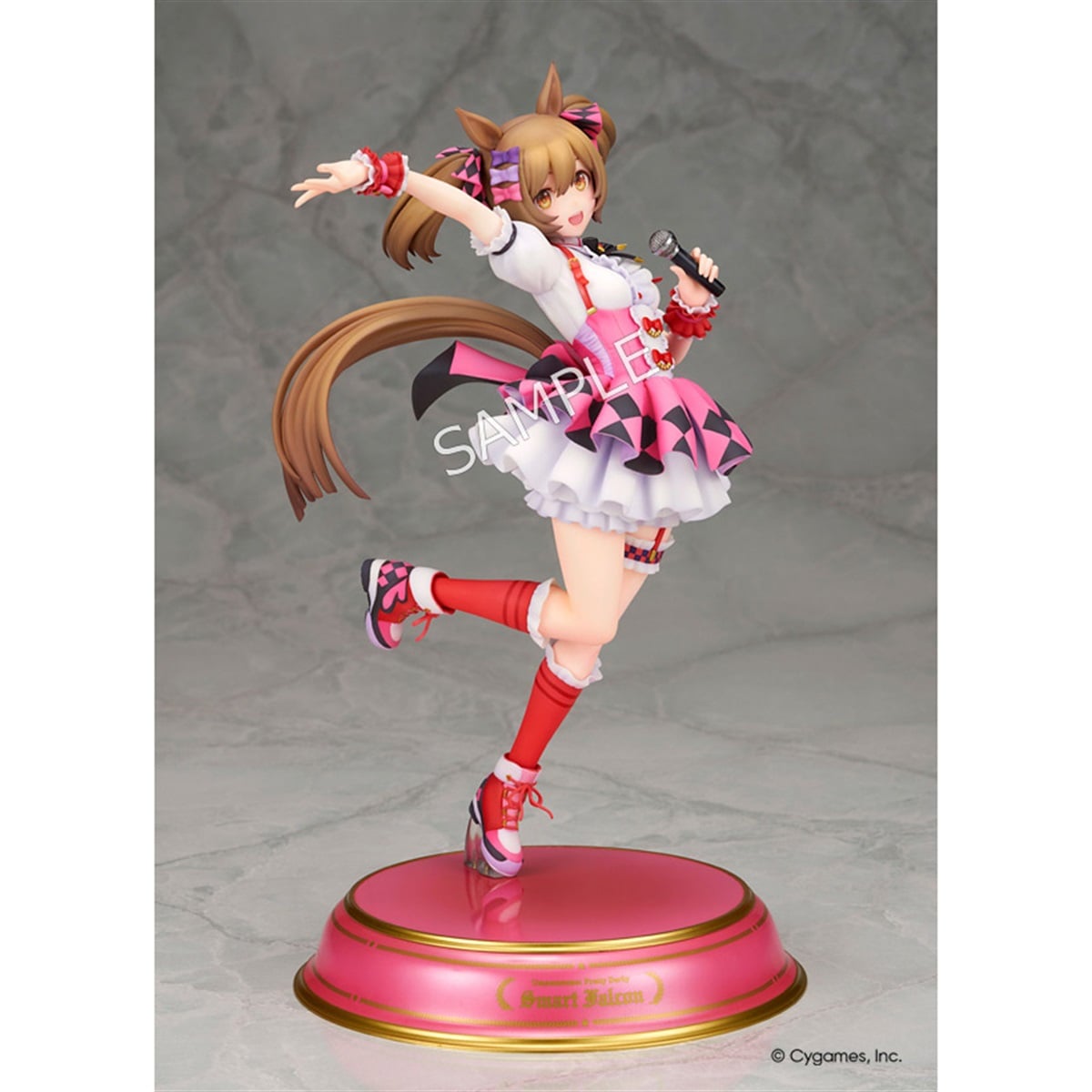 ゲーム『ウマ娘 プリティーダービー』より“スマートファルコン”が塗装済み完成品で登場。トップウマドル(ウマ娘のアイドル)を目指す彼女を、ウイニングライブのステージを思わせる明るい表情とアクティブなポージングで立体化しました。ピンクを基調とした勝負服も実感豊かに再現。柔らかく広がったスカートや丁寧に造形された各部の装飾が華やかな印象を盛り上げます。作り込まれたマイクやシューズもフィギュア全体をさり気なく引き締めています。