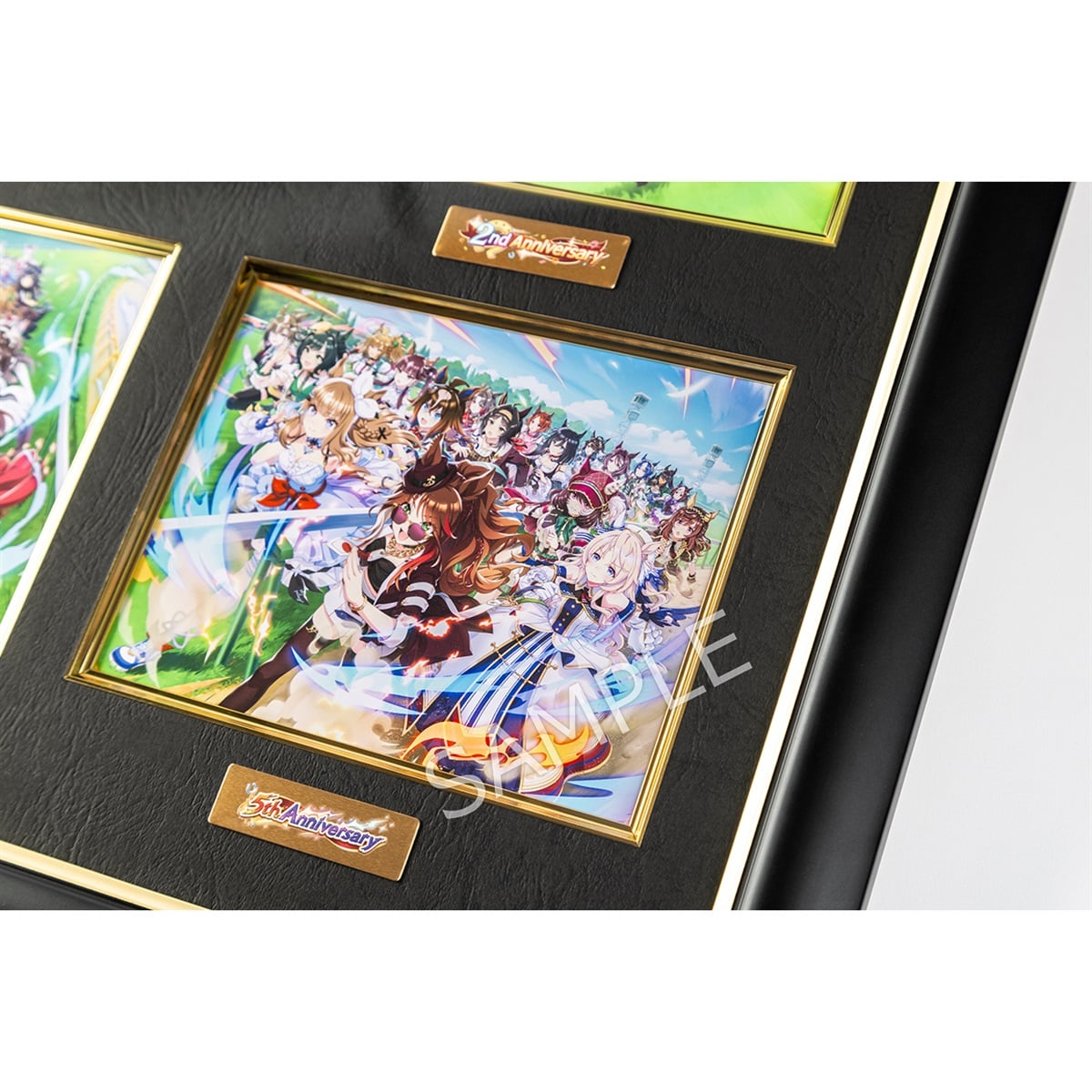 ウマ娘 プリティーダービー ゲーム5周年の歩みを辿る、過去キービジュアルから5周年キービジュアルが集合したキャラファイン(高品位美術印刷)を重厚感のある額装で用意しました。 1点ずつ異なるシリアルナンバーをプレートに刻印してお届けいたします。
