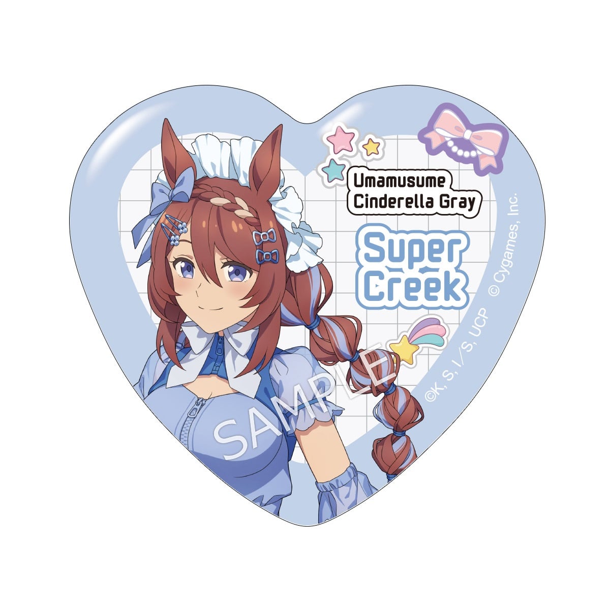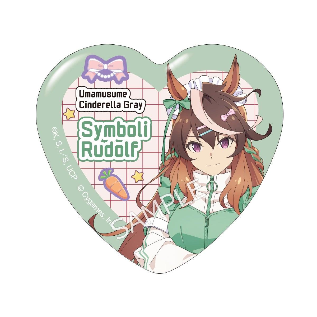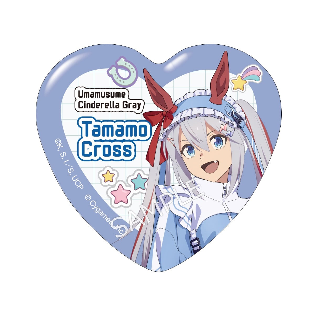 「アニメ『ウマ娘 シンデレラグレイ』 キャラポップストア ~Cute Jersey Collection~」のコラボオリジナルグッズ、ハート缶バッジです。