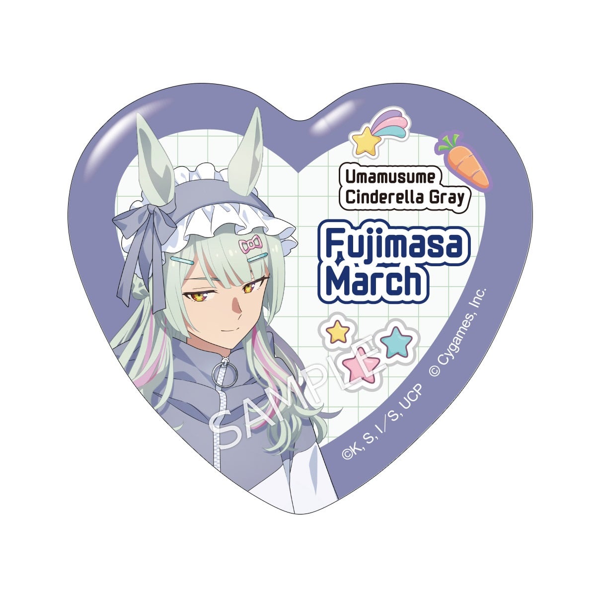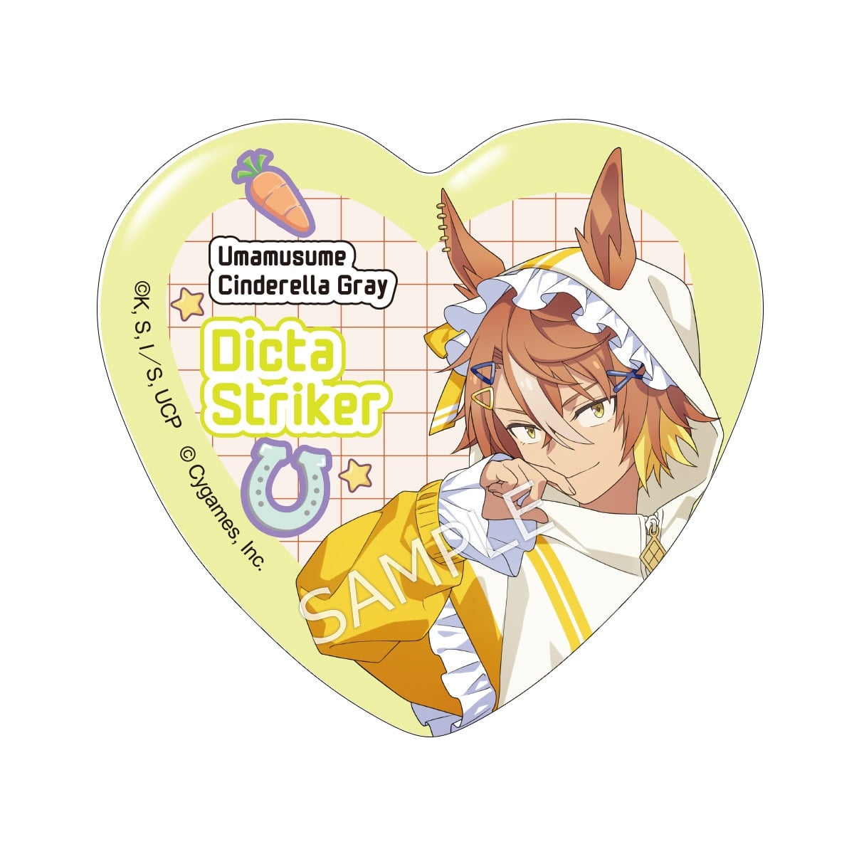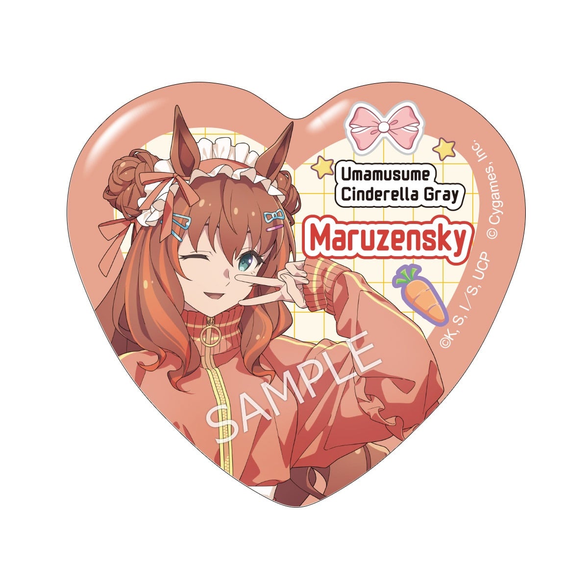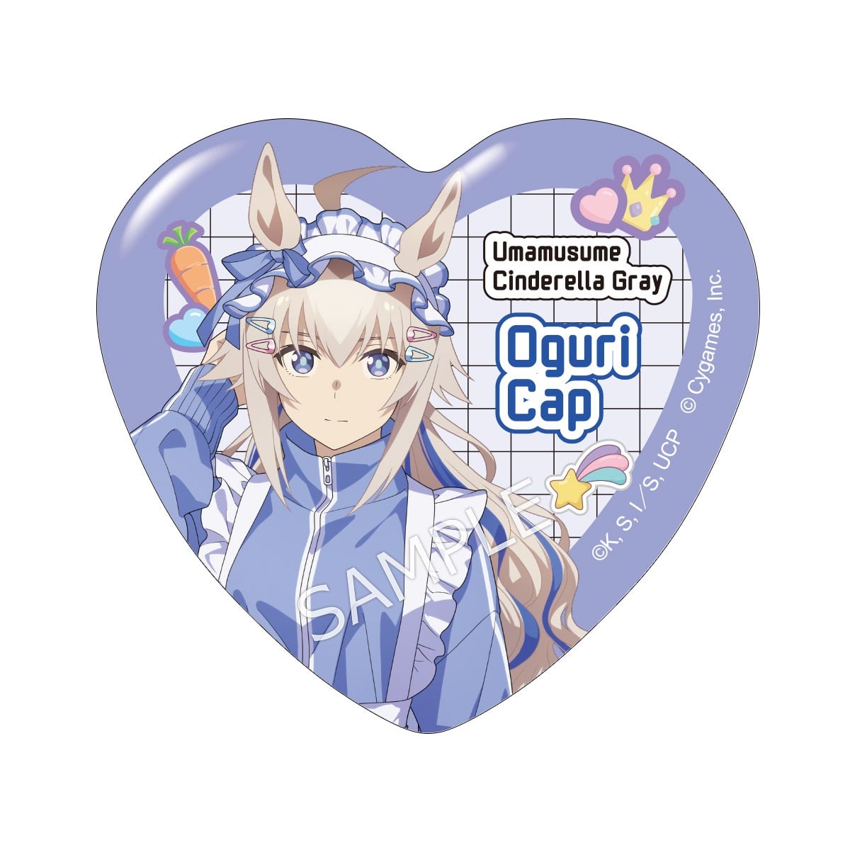 「アニメ『ウマ娘 シンデレラグレイ』 キャラポップストア ~Cute Jersey Collection~」のコラボオリジナルグッズ、ハート缶バッジです。