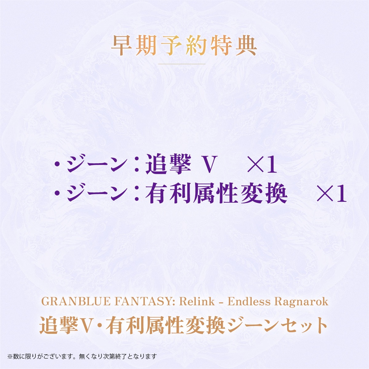 【 商品構成 】■収録内容■Steam用キーコード ・GRANBLUE FANTASY: Relink - Endless Ragnarok アップグレードキット・GRANBLUE FANTASY: Relink - Endless Ragnarok スペシャルパック「主人公」「イド」「サンダルフォン」の特別なキャラクターカラーと、「シエテ」「ソーン」「サンダルフォン」の解放に役立つアイテムセットです。 ▼内容 ●コンセプトカラーパック - 主人公(グラン/ジータ) - イド - サンダルフォン ●蒼穹の輝き ×5個 ●カナンの白花 ×3個 ●窮極たる器の極意 ×6個・GRANBLUE FANTASY: Relink DLCコレクション 「GRANBLUE FANTASY: Relink」で配信されたDLC「アップグレードパック」と、「キャラクターカラーパック(5種)」「エモートセット(3種)」をまとめたお得なセットです。 ▼内容 ●GRANBLUE FANTASY: Relink - アップグレードパック ●GRANBLUE FANTASY: Relink - キャラクターカラーパック1 ●GRANBLUE FANTASY: Relink - キャラクターカラーパック2 ●GRANBLUE FANTASY: Relink - キャラクターカラーパック3 ●GRANBLUE FANTASY: Relink - キャラクターカラーパック4 ●GRANBLUE FANTASY: Relink - キャラクターカラーパック5 ●GRANBLUE FANTASY: Relink - エモート追加セット「コミュニケーション」 ●GRANBLUE FANTASY: Relink - エモート追加セット「筋トレ」 ●GRANBLUE FANTASY: Relink - エモート追加セット「バラエティ」※上記アイテムに関してはダウンロード後、ゲーム内の「よろず屋シェロ」に話しかけ、「追加コンテンツ受け取り」から受け取るコンテンツを選択することで、ダウンロードしたアイテムを入手することができます--------------------------------------------------------------------------■早期予約特典■・GRANBLUE FANTASY: Relink - Endless Ragnarok 追撃V・有利属性変換ジーンセット 強敵との戦闘に役立つレアジーンのセットです。 ▼内容 ●ジーン:追撃 V ×1 ●ジーン:有利属性変換 ×1 ※数に限りがございます。無くなり次第終了となります ※本特典のご利用にはインターネットへの接続が必要です ※同一商品を複数購入しても、本特典の受け取りは、1アカウントにつき1回限りです ※インゲームアイテムをご利用いただくには、製品版が必要です。また、最新版パッチの適用が必要な場合はアップデートのうえ、ご利用ください--------------------------------------------------------------------------■CyStore購入特典 ■ ・GRANBLUE FANTASY: Relink - Endless Ragnarok CyStore限定 先着購入特典 クリアファイル(B5) CyStoreにて『GRANBLUE FANTASY: Relink - Endless Ragnarok』を ご購入いただいたお客様に、先着でオリジナル「クリアファイル(B5)」をプレゼント! 気になるデザインは後日発表予定です。続報をお楽しみに! ※数に限りがございます。無くなり次第終了となります サイズ:B5 素材:PP・CyStore特典「GRANBLUE FANTASY: Relink - Endless Ragnarok エクストラアイテムパック」 ジーン:明鏡止水 IV ✕1 ダマスカス鋼 ✕1 武練の結晶・小 ✕10 ピカピカ結晶の塊 ✕1 MSP ✕500 ※数に限りがございます。無くなり次第終了となります--------------------------------------------------------------------------【GRANBLUE FANTASY: Relink - Endless Ragnarok CyStore特装版グッズ】・メタリックウェポン ショーケース「七星剣」サイズ:本体 全長約230mm / フレーム 約W250×H80mm×D60mm素材:七星剣:ダイキャスト、アクリル製宝石 フレーム:アクリル、MDF・「ルーレット」キーホルダーサイズ:約H70mm×D15mm素材:ルーレット本体:ダイキャスト / 文字盤:アクリル・CyStore描き下ろしアクリルアート(A5)サイズ:約W215mm×H145mm×D4mm素材:アクリル、紙・アートブック「The Museum of Endless Ragnarok(B5書籍)」サイズ:B5書籍(約70ページ想定)※数に限りがございますので、無くなり次第終了となります--------------------------------------------------------------------------【ゲーム本編】プレイ人数:1人 (オンライン時:最大4人)発売日:2026年7月9日対象年齢:12才以上(CERO:B)--------------------------------------------------------------------------メーカー:Cygames