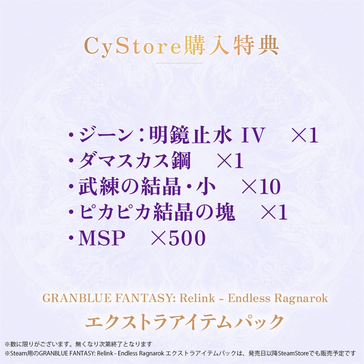 ※ご購入前にセット内容に関する詳細をご確認ください※バージョンごとのセット内容をよくご確認のうえ、ご購入ください※本商品は『GRANBLUE FANTASY: Relink』をお持ちの方向けの商品です※既にお持ちの「GRANBLUE FANTASY: Relink」を同一プラットフォームの「GRANBLUE FANTASY: Relink - Endless Ragnarok」にアップグレードが可能です※ご購入前に、セット内容に関する詳細をご確認ください※バージョンごとのセット内容をよくご確認のうえ、ご購入ください※ダウンロードに必要なSteam CDキーが印字されたカードをお届けします※こちらは日本国内向け製品に関する情報です※商品画像はイメージです。実際の商品とは異なる場合がございます※ゲーム内容は開発中のものです*The CyStore Exclusive Edition is available only in Japan. Customers outside Japan can purchase the Exclusive Edition goods only.【お届けに関する注意事項】※発売日当日にお届けできるよう、発売日前日までに発送いたします※ただし、以下のようなケースでは発売日当日にお届けできない場合がございます・6月21日23:59以降にご注文いただいた場合・6月21日以降にお届け先変更のご連絡をいただいた場合・注文時にご入力いただいたお届け先情報に不備がある場合・宅配業者が発売日に配達した際にお客さまが商品を受け取れなかった場合、また、受け取らなかった場合・宅配業者の作業中に事故や問題が発生した場合・お届け先が離島である場合・地震、津波、台風、雷、大雨、洪水などの天災、戦争、テロ行為、革命、労働争議、大規模な感染拡大を伴う感染症など(これらの事象に関する政府・各自治体による措置や要請を含みます。)の不可抗力が発生した場合※ストアからの発送が完了していても、マイページ上のご注文状況に反映されるまで時間がかかる場合がございます【動作環境】本ゲームをプレイするには、システム要件を満たしたPCが必要です。【システム要件】最低:64 ビットプロセッサとオペレーティングシステムが必要ですOS: Windows® 11 (64-bit 必須)プロセッサー: Intel® Core™ i3-9100 / AMD Ryzen™ 3 3200Gメモリー: 16 GB RAMグラフィック: NVIDIA® GeForce GTX™ 1060 6GB / AMD Radeon™ RX 580 8GBDirectX: Version 11ストレージ: 90 GB の空き容量追記事項: SSD環境推奨 グラフィック設定の映像品質「標準」で、1080p/30fpsのゲームプレイが可能。-----------------------------------------------------------------------------推奨:64 ビットプロセッサとオペレーティングシステムが必要ですOS: Windows® 11 (64-bit 必須)プロセッサー: Intel® Core™ i7-8700 / AMD Ryzen™ 5 3600メモリー: 16 GB RAMグラフィック: NVIDIA® GeForce RTX™ 2080 8GB / AMD Radeon™ RX 6700 XT 8GBDirectX: Version 11ストレージ: 90 GB の空き容量追記事項: SSD環境推奨 グラフィック設定の映像品質「最高品質」で、1080p/60fpsのゲームプレイが可能。【注意事項】・ゲームの有効化およびゲームプレイには、インターネット接続及び無料のSteamアカウントの登録が必要です。・本製品は、Steam 利用規約(SSA)に対するお客様の同意を前提条件として提供されています。・本製品を有効化するには、インターネットで、Steam アカウントに登録し、SSAに同意する必要があります。 購入される前に、https://store.steampowered.com/subscriber_agreement/ にアクセスして、SSAをご確認ください。【Steam CDキーのご利用方法】① Steamクライアントを起動し、ゲームをインストールするSteamアカウントでログインしてください。② 画面上部のメニューから[ゲーム]-[Steamで製品を有効化する…]を選択してください。③ 「製品コードを入力してください」と表示されますので、記載のSteam CDキーを入力し、「確認」をクリックしてください。④ 有効化が完了したら、表示される画面の手順に従って対象のゲームをインストールしてください。バックグラウンドでダウンロードの進行状況の確認ができます。画面左および画面下部にダウンロードの進行状況が表示されますので、ダウンロードが完了するまでお待ちください。⑤ ダウンロード、インストール完了後は、「プレイ」ボタンをクリックするとゲームがプレイできます。【Steam CDキーのご利用に関する注意】・Steam CDキーは一度のみ利用できます。・Steam CDキーのご利用前に、製品を有効化したいSteamアカウントにお間違えがないかご確認ください。・一度有効化された製品は、他のSteamアカウントに移行できません。・Steamでのゲーム配信開始前に、ゲームのインストールやプレイはできません。・Steam CDキーの紛失、盗難、破損、漏洩などについて、株式会社Cygamesでは責任を負いかねますのでご了承ください。 また、Steam CDキーの再発行などもいたしかねます。・記載のSteam CDキーはValve Corporationの返品・返金の対象外です。