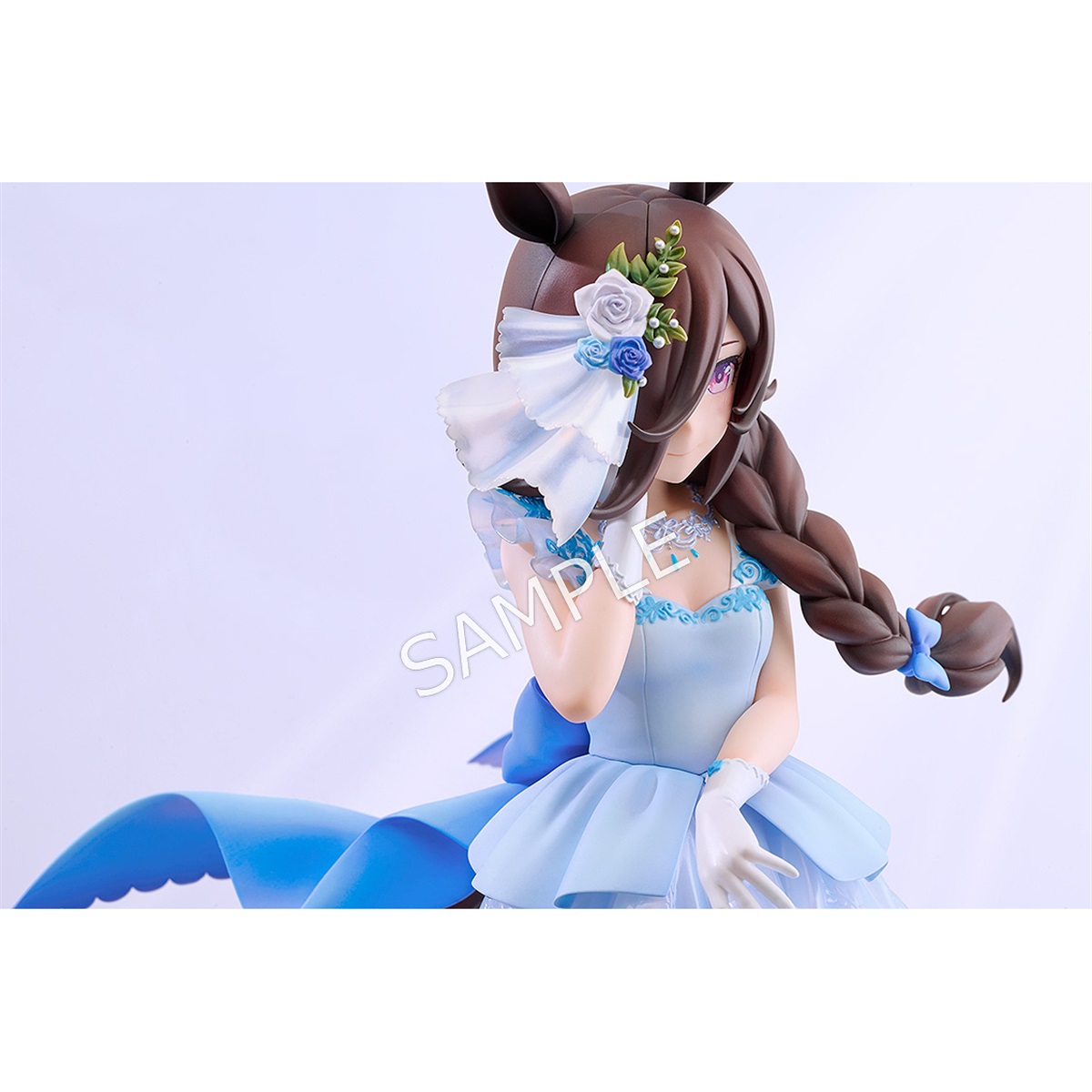 よかった……ライスもなれたんだ……! みんなを笑顔にする、憧れのミューズに……っ!ゲーム『ウマ娘 プリティーダービー』より、内気で心優しいウマ娘「ライスシャワー」が、ウェディングドレス姿でスケールフィギュア化。“みんなを笑顔にするミューズになりたい”という願いを胸に、優しい微笑みを浮かべ、そっとドレス姿をお披露目する瞬間を立体で表現しました。淡いブルーのドレスは、流れるような造形で軽やかさと透明感を兼ね備えた仕上がりに。髪飾りや胸元のアクセサリー、裾を彩るレースの意匠まで細部にこだわり、繊細で清らかな雰囲気を余すところなく再現いたしました。あこがれの景色へと踏み出すライスシャワーの大切な一瞬を、ぜひお手元でお楽しみください。
