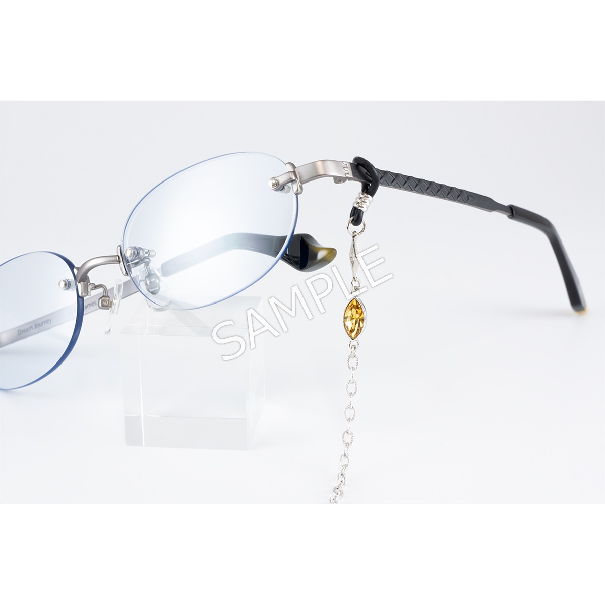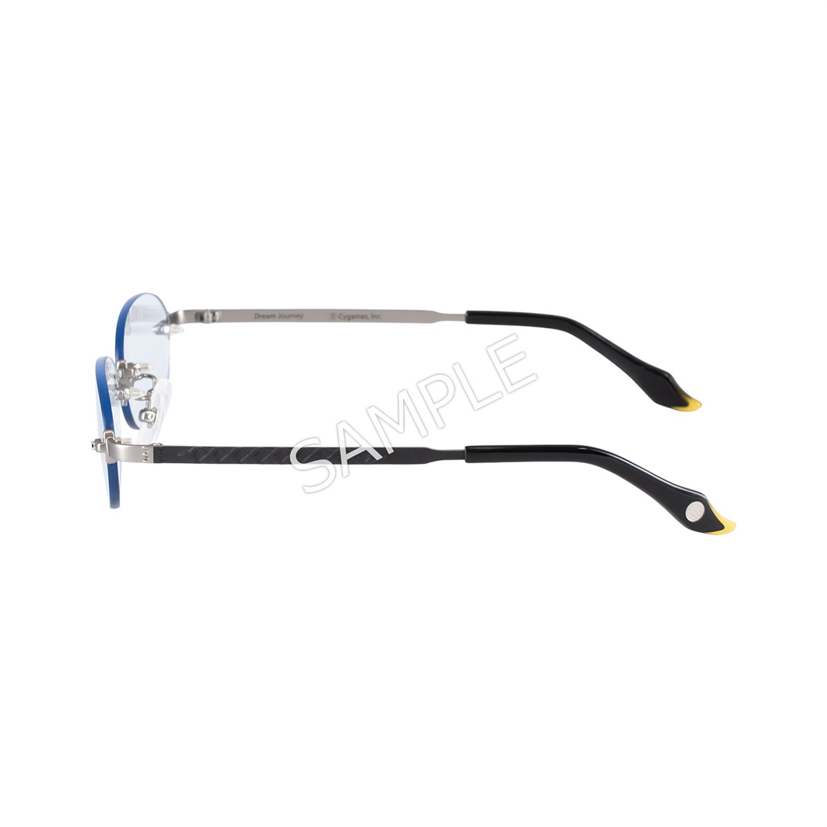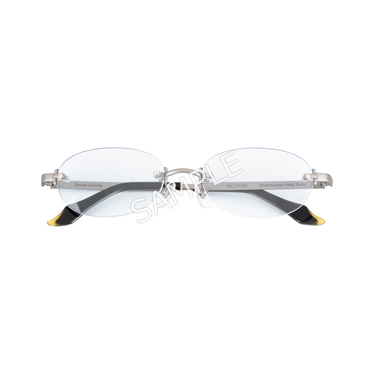 ドリームジャーニーが着用している「リムレスフレーム、メガネチェーン」を表現!落ち着いた質感のグレーシルバーのリムレス(フチなし)フレーム。ドリームジャーニーのように優等生らしく知的な印象に仕上げました。ヨロイ(つるに繋がる部分)には、ドリームジャーニーの靴底をイメージした模様をさりげなく施しています。テンプル(つる)には、勝負服の編み上げ模様を立体的にあしらいました。先セル(先端)は、耳をイメージし、黒とイエローのセル生地を繋ぎ合わせたデザインを採用。コンパスのモチーフも取り入れました。メガネチェーンは取り外し可能です。普段使いしやすい「クリアレンズ(透明)」タイプと、ドリームジャーニーのメガネを表現した「ブルーレンズ」の2種類ご用意。予約購入特典に、描き起こしイラストを使用したミニアクリルスタンドが付属します。