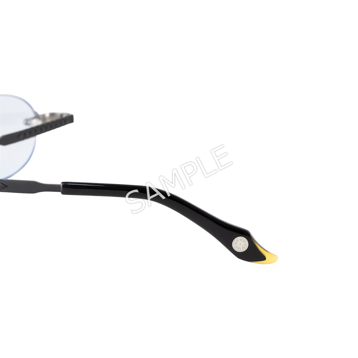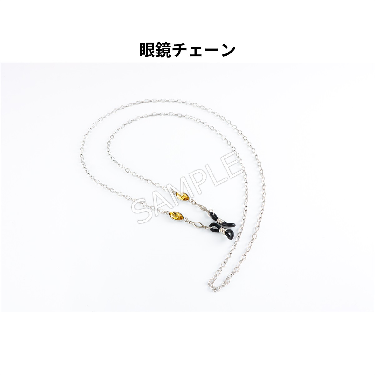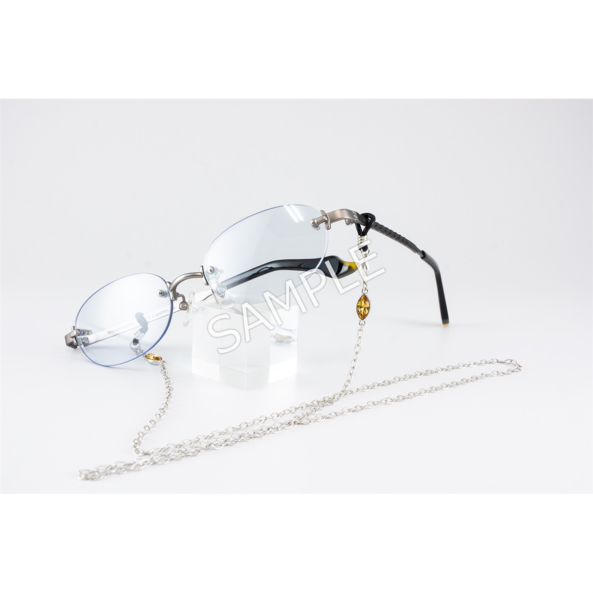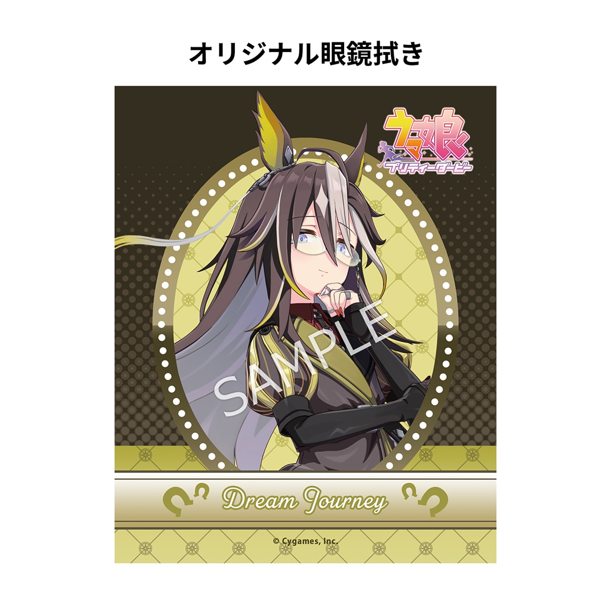 ドリームジャーニーが着用している「リムレスフレーム、メガネチェーン」を表現!落ち着いた質感のグレーシルバーのリムレス(フチなし)フレーム。ドリームジャーニーのように優等生らしく知的な印象に仕上げました。ヨロイ(つるに繋がる部分)には、ドリームジャーニーの靴底をイメージした模様をさりげなく施しています。テンプル(つる)には、勝負服の編み上げ模様を立体的にあしらいました。先セル(先端)は、耳をイメージし、黒とイエローのセル生地を繋ぎ合わせたデザインを採用。コンパスのモチーフも取り入れました。メガネチェーンは取り外し可能です。普段使いしやすい「クリアレンズ(透明)」タイプと、ドリームジャーニーのメガネを表現した「ブルーレンズ」の2種類ご用意。予約購入特典に、描き起こしイラストを使用したミニアクリルスタンドが付属します。