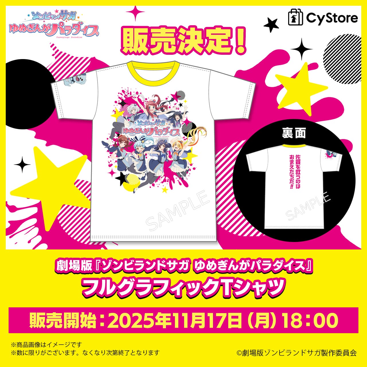 New 劇場版『ゾンビランドサガ ゆめぎんがパラダイス』フルグラフィックTシャツお取り扱い決定! 2025.11.13 佐賀を救うのはおまえたちだ!! 佐賀県内自治体職員が着用し話題となった、劇場版『ゾンビランドサガ ゆめぎんがパラダイス』広報Tシャツをたくさんのご要望にお応えして、一部デザインを変更し一般販売開始! ■商品ラインナップ ・劇場版『ゾンビランドサガ ゆめぎんがパラダイス』フルグラフィックTシャツ サイズ:Lサイズ/XLサイズ 価格:各 5,500円(税込) ■販売開始日時 2025年11月17日(月)18:00~ ※数に限りがございます。なくなり次第終了となります 前の記事を読む お知らせ一覧へ戻る
