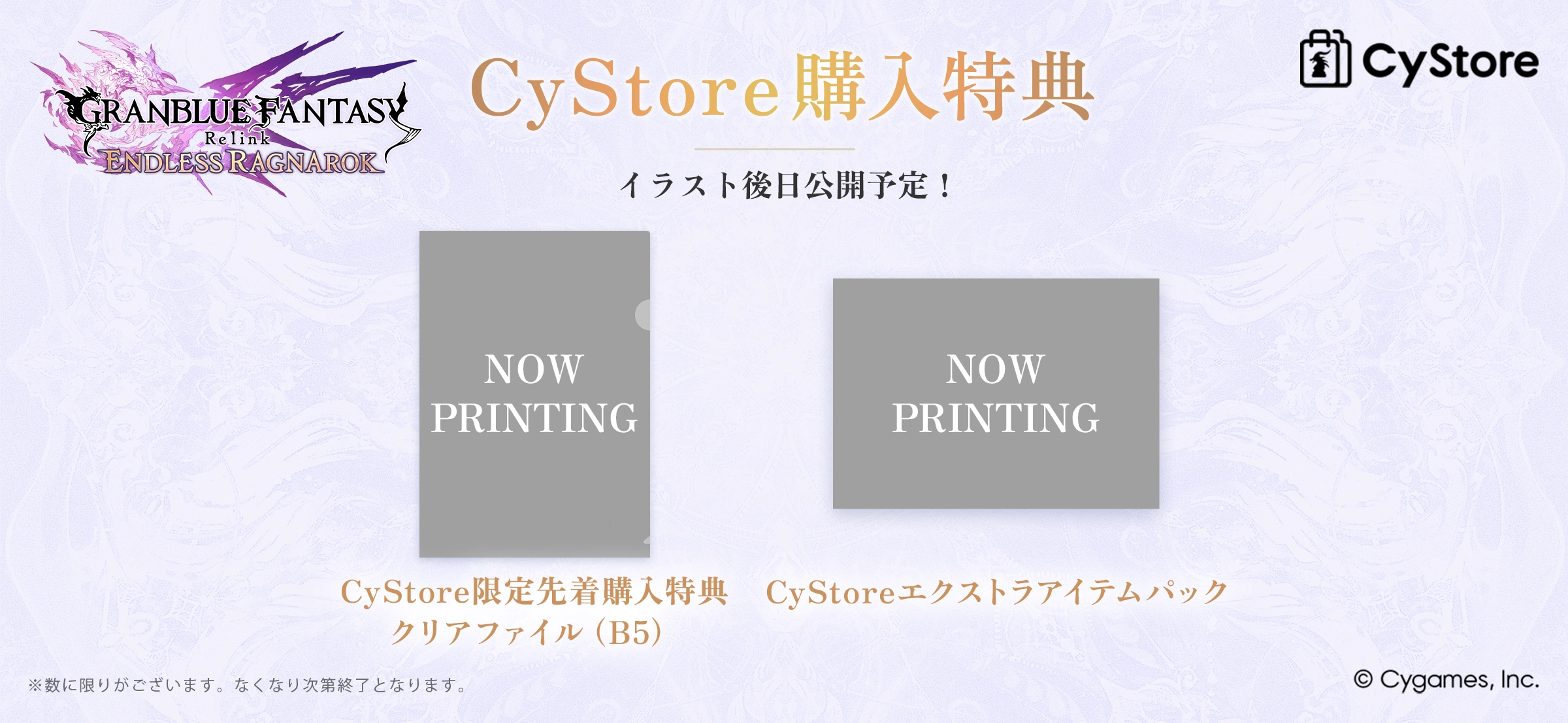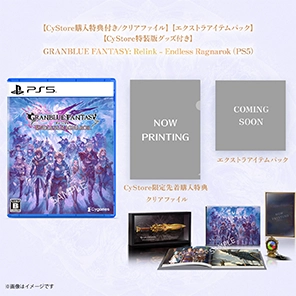 CyStoreにて『GRANBLUE FANTASY: Relink - Endless Ragnarok』をご購入いただいたお客様に、先着でオリジナル「クリアファイル(B5)」をプレゼント! 気になるデザインは後日発表予定です。続報をお楽しみに! ※数に限りがございますので、無くなり次第終了となります